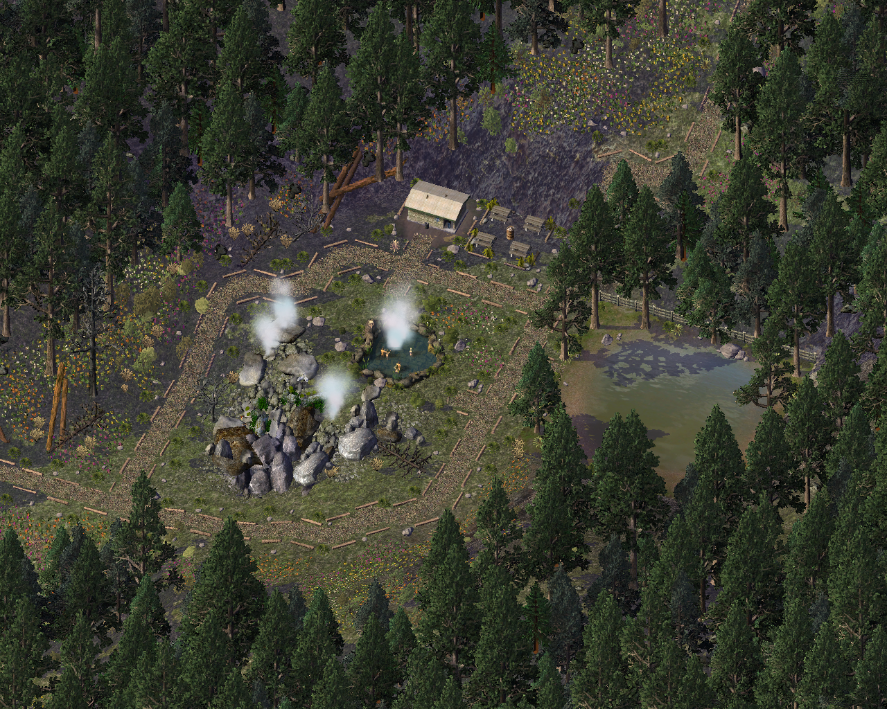 There was no one else around so Jaak and Dieter soon peeled off their t-shirts and shorts and joined Tag in the refreshingly cool spring. After they had washed all the dust and wood chips off they were feeling much more refreshed, so they headed over the the hot spring pool to warm up. The hot spring pool was small and only suitable for sitting in, but of course that hardly mattered as sitting was the perfect thing to do in a hot pool. They had been sitting in the hot pool for a little while when they heard a familiar voice from behind the rocks.